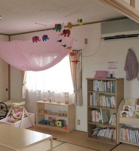 天井から布を吊るしたのは、天井を低くして、少し光も遮って、落ち着いた環境にするためです。子どもは包まれるような中で安心して遊べるようです。狭いところとか、好きですよね!