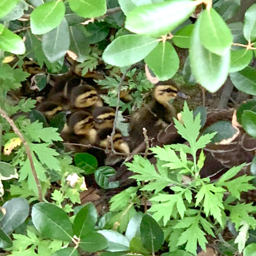 帰宅すると、家の駐車場近くに人が集まっています。何事かと思えばご近所の方、「カルガモがいるんだよ」とのこと。母カルガモを先頭に行列で道を歩いて来て、自宅敷地の方に入っていき、奥の樹木が茂っているところに落ち着いたらしいのです。見ると、確かにいました。