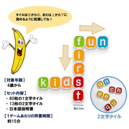 | 内容 | バナナ型収納ケース、1文字タイル80、2文字タイル13、日本語説明書 |