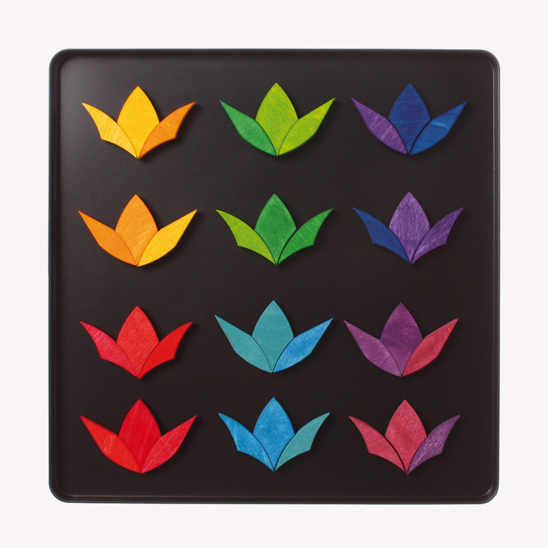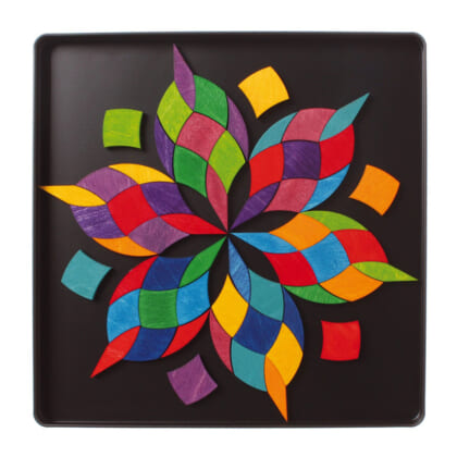 12色の三日月の形がぐるっとねじれてきれいに丸を作っています。ひとつひとつのピースの形を見ると、全てが集まったときとは印象が変わり、組み合わせによって思いがけない形になります。マンダラ模様から、お花や魚まで、次々と色と形が変化します。