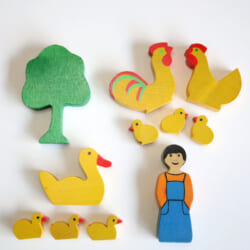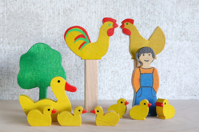 アルビスブラン社の動物積木、農場セットです。11ピースがセットになっています。にわとりとひよこ、あひるの親子、木と人も入った楽しいセットです。人は、赤い服と青い服の2色があります。