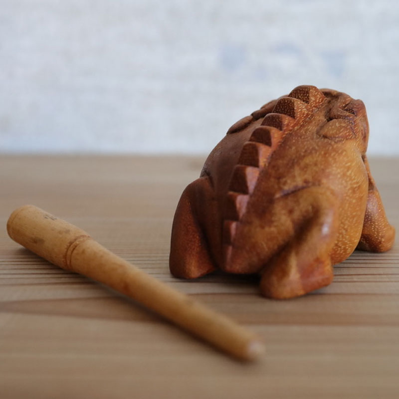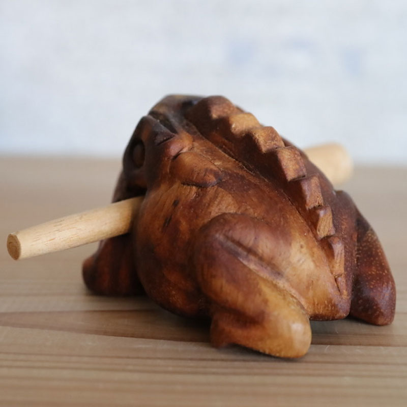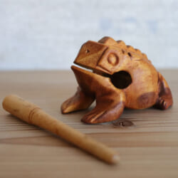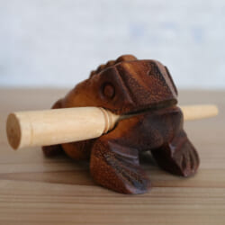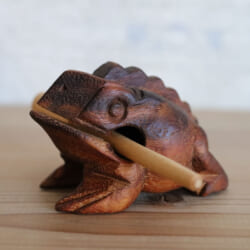 カエルの形の楽器です。背中を棒でこするとゲコゲコ音が鳴ります。カエルの鳴き声のようです。付属のスティックは、口にくわえさせて収納できます。シンプルですが、よく響きますし、細工も凝っています。置物としても存在感があります。