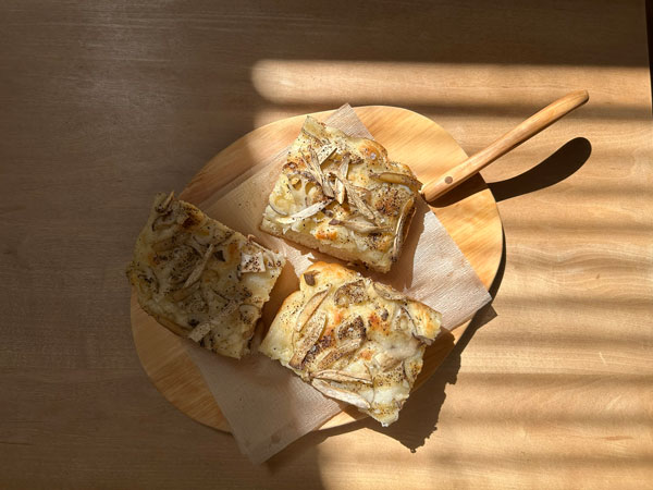 朝から何をしたいか決まっているのはいいですね。フォカッチャとカルダモンを同士進行でつくっていきます。フォカッチャは何度か作っていますが、どこかで手順を間違えてもおいしくなるとても助かるレシピです。今日のトッピングはエリンギとれんこんでした。