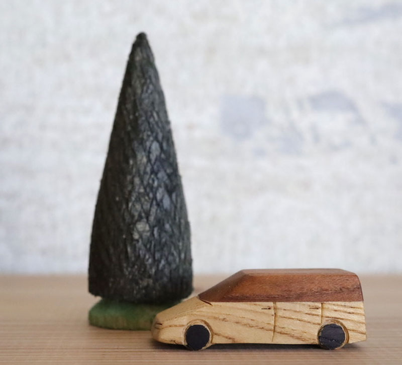 素朴な針葉樹の置物は、梅里進さんのお家や車とぴったり合い、風景を彩ります。