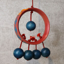 ひもで吊り下げて使います。リングをつかんで振ったり、青い玉に触れて動きや音を楽しみます。木製リングに木玉が触れる音は軽やかで、心地よさを感じます。