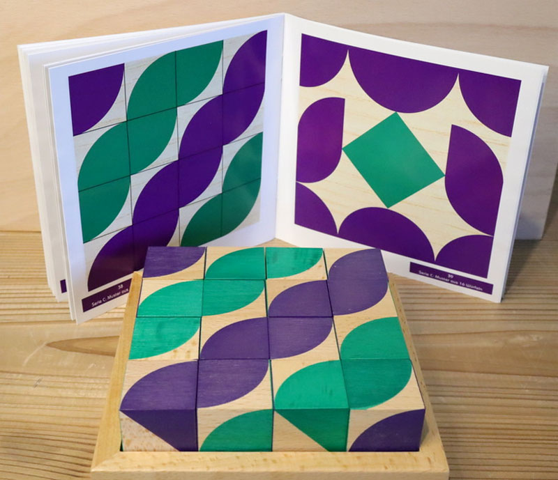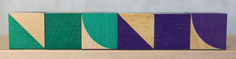 それぞれの色に3パターンの模様があります。正方形・三角・四分円という基本図形を組み合わせる構成になっています。直線・曲線・角度感覚など幾何的認識を扱いやすい形状です。