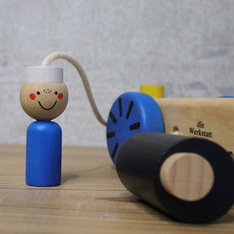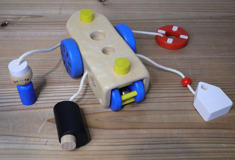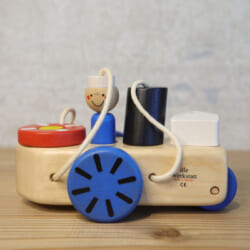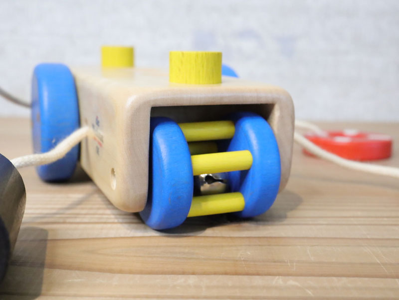 船には車輪がついており、後方には鈴が入ったスクリューがあります。手で押して動かしても楽しいおもちゃです。