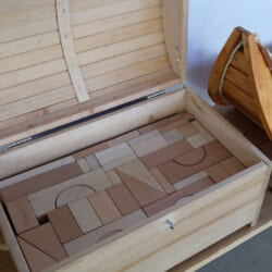 ショルナー社の木製宝箱にアルビスブラン社の積木が入っています。積木はたっぷりアソート130ピース以上。しっかり遊べます。