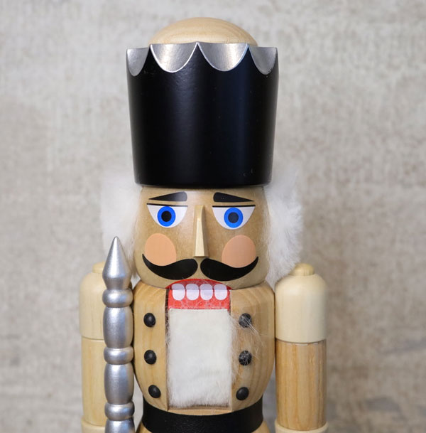 ザイフェナー・フォルクスクンスト、白木の木目が美しいくるみ割り人形です。なんとなくタレ眉と丸いほっぺが、ひげや大きな口をユーモラスにしています。