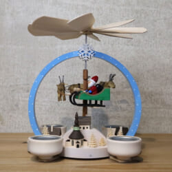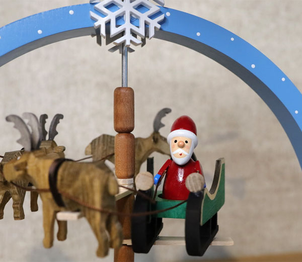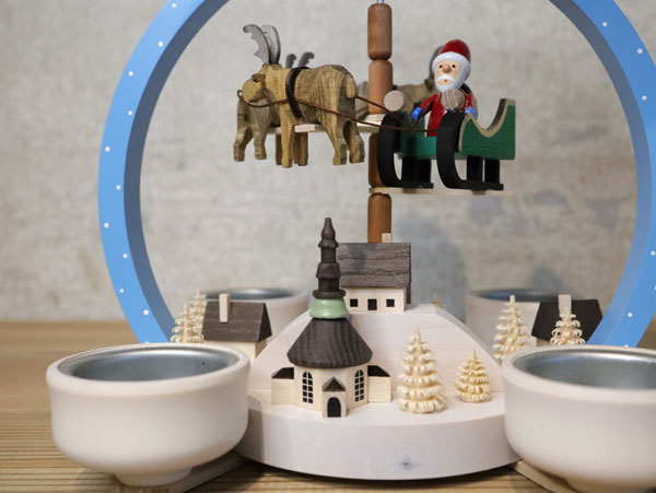 土台には4つのキャンドルホルダーがあり、一番上にはプロペラをセットします。キャンドルホルダーにキャンドルを立て、火を付けると、熱による気流でプロペラがくるくる回ります。トナカイとサンタさんも一緒に回ります。