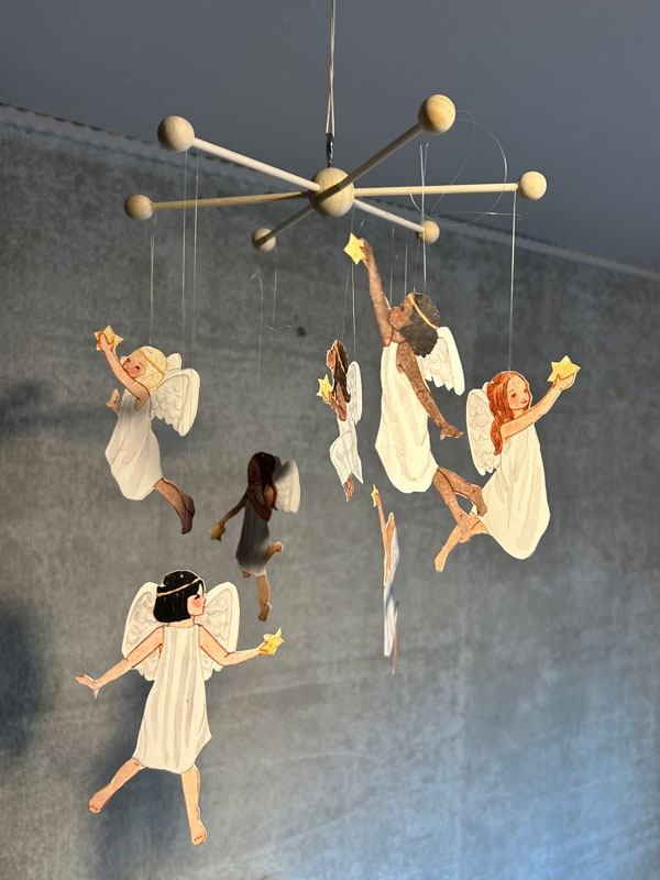 組み立てたら、お好きなモチーフを吊り下げてモビールを楽しみましょう。棒は6本です。吊り下げてからモチーフを取り付けるとバランスを取りやすいです。