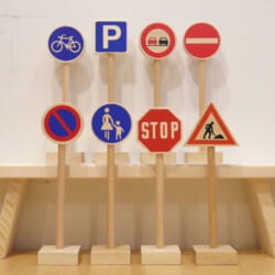 街にはいろんな交通標識が掲示されており、子どもたちは興味津々です。積木遊びや車遊びの中に標識をおいてあげると、標識の意味を考えながら遊びにストーリーが生まれます。