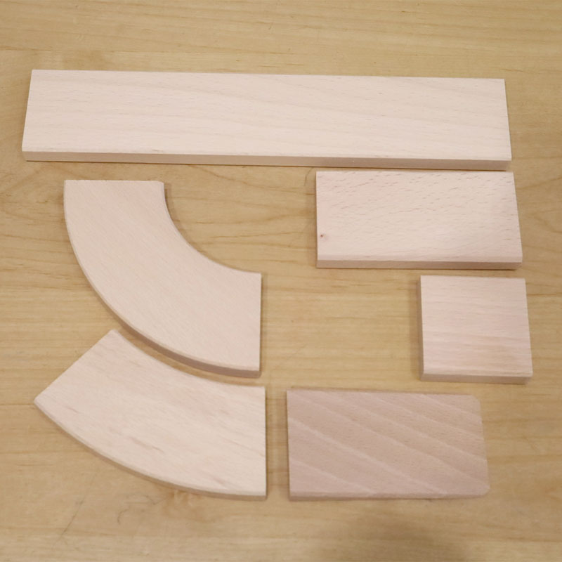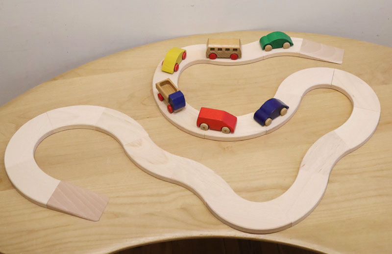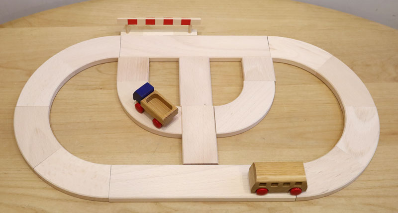 直線とカーブと傾斜つきの薄板積み木セットです。並べて道路に見立てたり、板積み木として積み木遊びに変化を加えます。