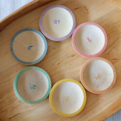 中央に小さな模様、模様と同じ色で縁取りがあるお皿6枚セットです。手作りの風合いが残る素朴な仕上がりが素敵です。