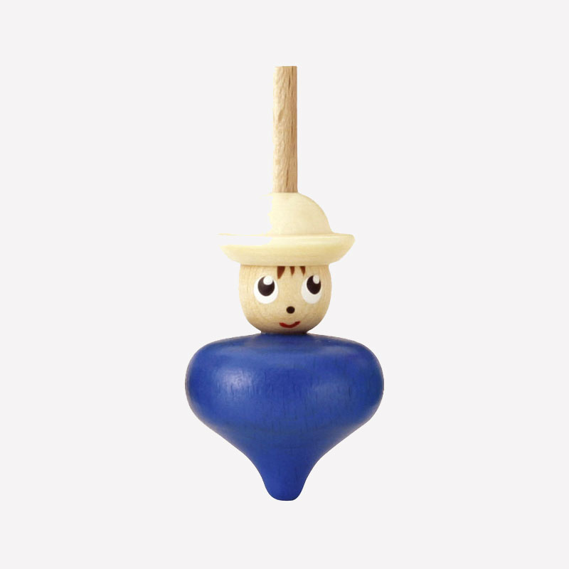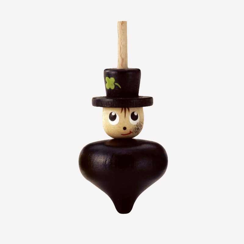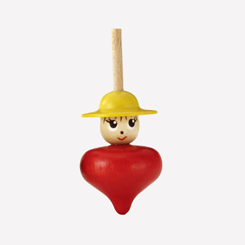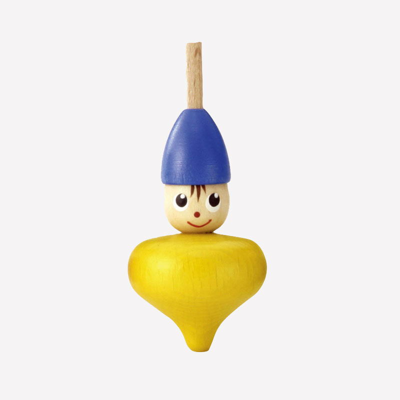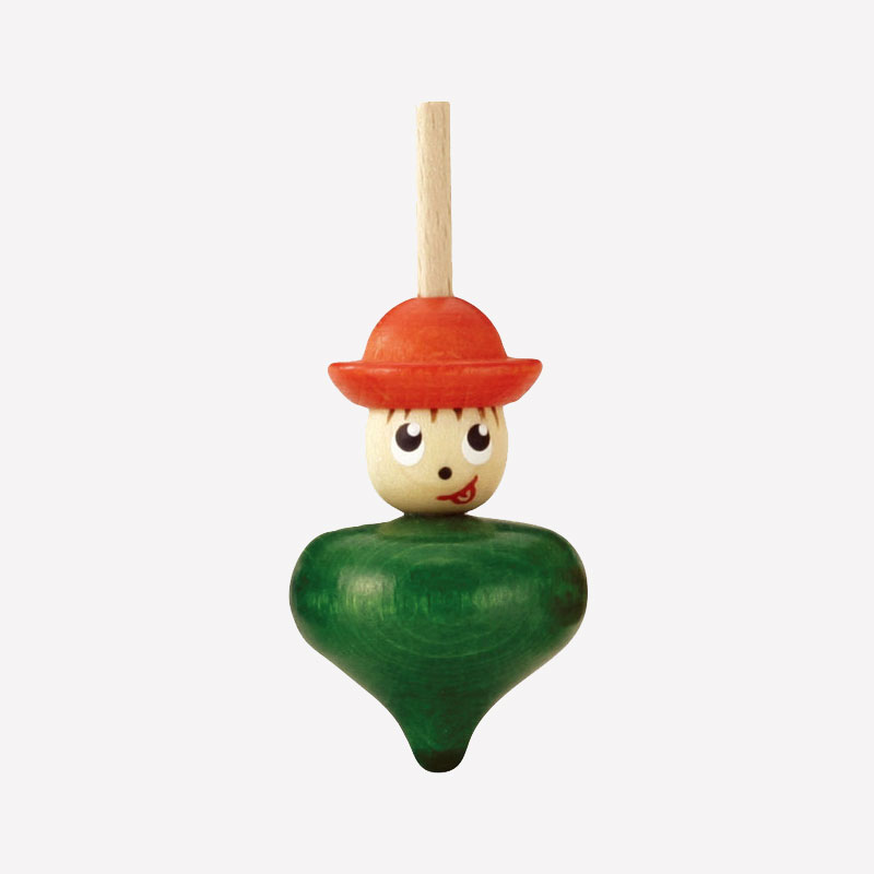 帽子とお顔の下に、お洋服のような本体が続き、縦に長い、お人形のようなこまです。軸が細く、バランスが取りにくく、まっすぐ安定して回すのはなかなか難しいです。指先をうまくひねって、できるだけフラフラしないように回してみましょう。