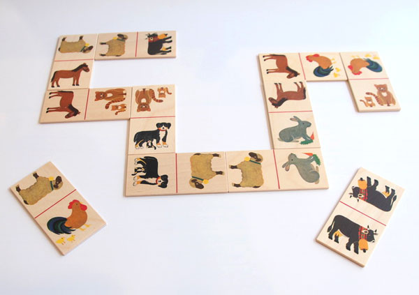 よく思い浮かべるのは薄い板を立てて並べ、パタパタと倒すドミノ倒し遊び。元々は、ドミノは薄い板の両側に描かれた模様をつなぎ合わせていく遊びです。その板を立てて並べて倒すと楽しいので、ドミノ倒しという遊びも広く普及しました。動物ドミノは、従来のドミノ遊びです。