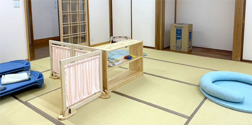 ついたてを使うと、ベッドで休む子と、静かに遊ぶ子と、それぞれが落ち着きます。大人もよく目が届きます。