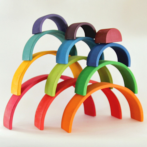 12ピースから成る大きな虹です。1本の木から切り出しているからでしょうか、ひとつひとつのピースには個性があるのに全体のバランスはとれています。アーチ型を利用して、ゆらゆら揺れる積み重ねも楽しんでみたいです。はっきりした色合いですが上品に仕上がっており、様々な空間に似合います。