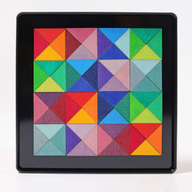 パーツは全て同じ大きさの二等辺三角形ですが、たっぷり64ピースあり、豊富な色を組み合わせると思いがけない模様や絵柄が現れます。時間を忘れてデザインに没頭してしまいそう。塗装にはツヤがなく、水彩画のような柔らかな雰囲気。厚み0.4cmの薄板で、平面的に仕上がります。