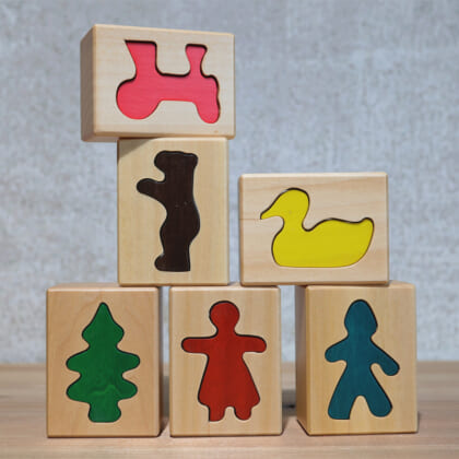 kiener キーナー キューブパズル・生き物 ¥9,350(税込) サイコロ型の六面体ピース4つを合わせると1つの絵柄ができあがります。それぞれの絵柄は色がはっきりしているので同じ絵柄になるものを探しやすいです。馴染みのある絵柄なので、親近感を持って取り組むことができます。はじめのうちは少し困難があるかもしれませんが、わかるようになると絵合わせも早くなります。